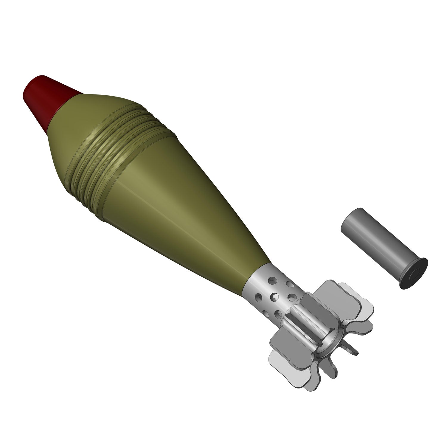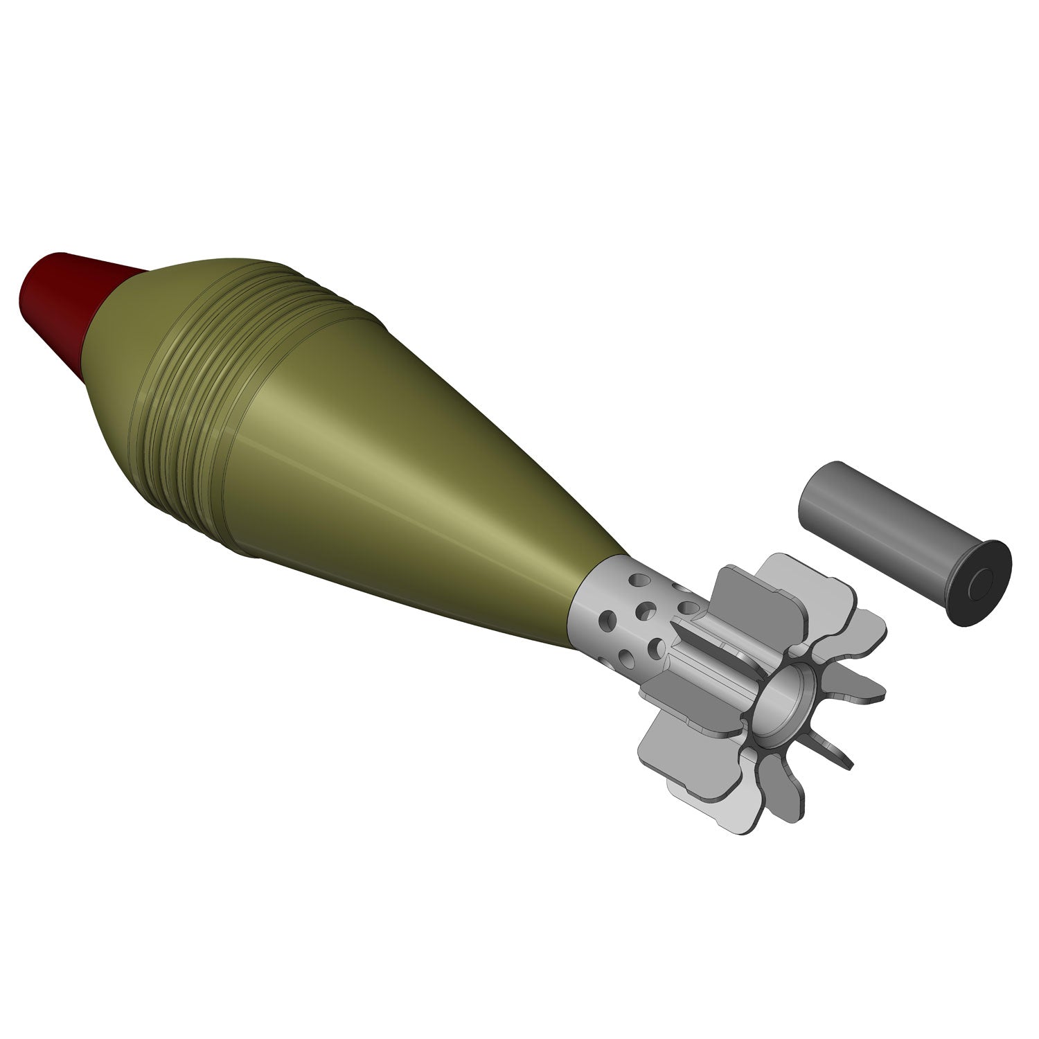 Inert replica of the Russian 82 mm HE mortar. The mortar is modular and can be equipped with M-5 and M-6 fuzes. The tail and fins unit are also removable. The charge cartridge can also be optionally inserted (UXO) to adapt identification and classification exercises. Mortar, fuze and tail are made of PA, aluminum.