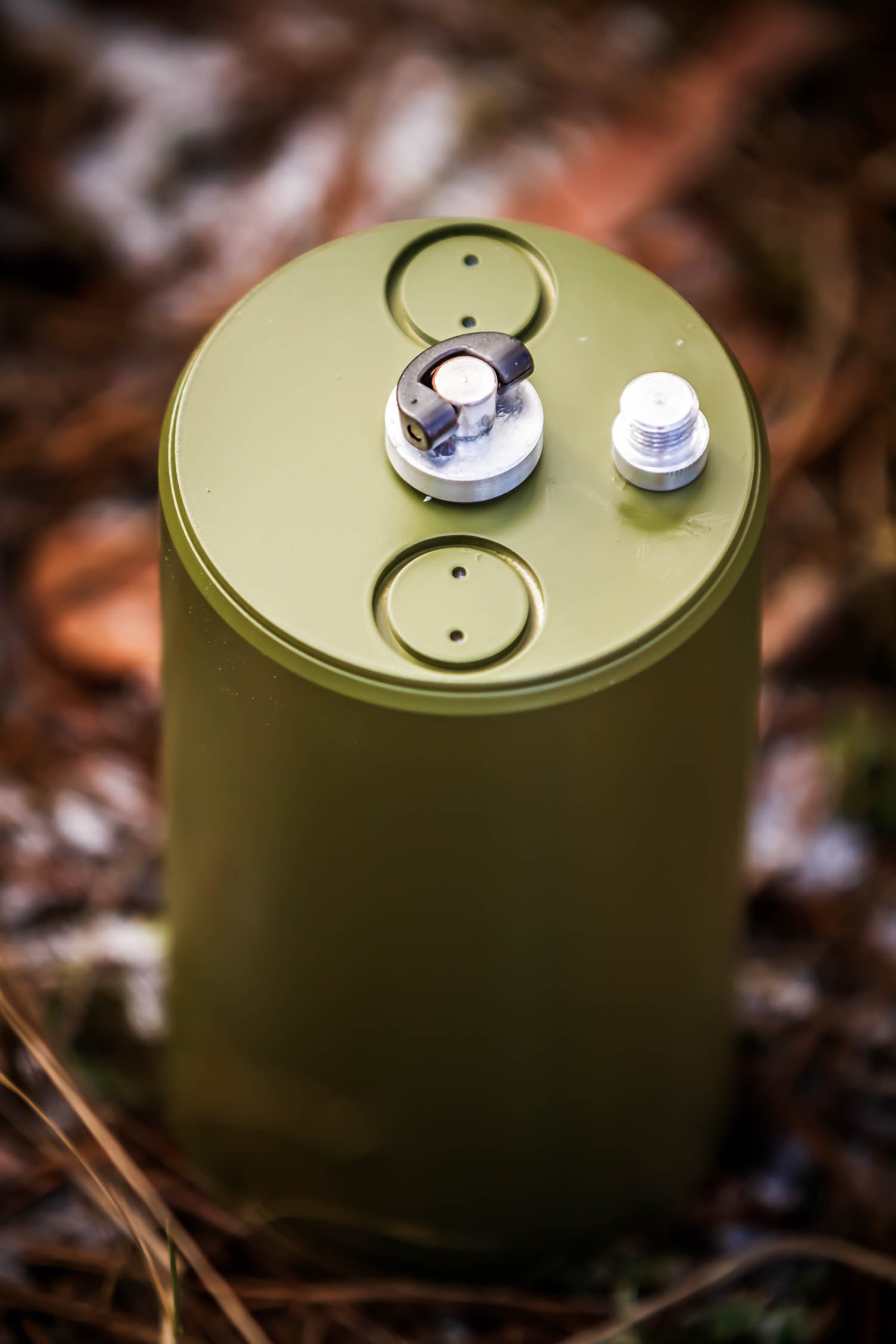 Inert replica of the Russian OZM-72 fragmentation mine. The mine comes with an ejection container, retention rope and ejection body (mine). The OZM-72 is also equipped with the two shafts that represent a part of the AND function (Arming-Neutralization-Disarming). As with the original, it is possible to arm the fuze and also reset it again (disarm/neutralize, if possible with the original). These functions are reversible and can be repeated countless times during training. The mine sits in its ejection shell and is connected to a stell retarding strap that connects the landmine with its container.
