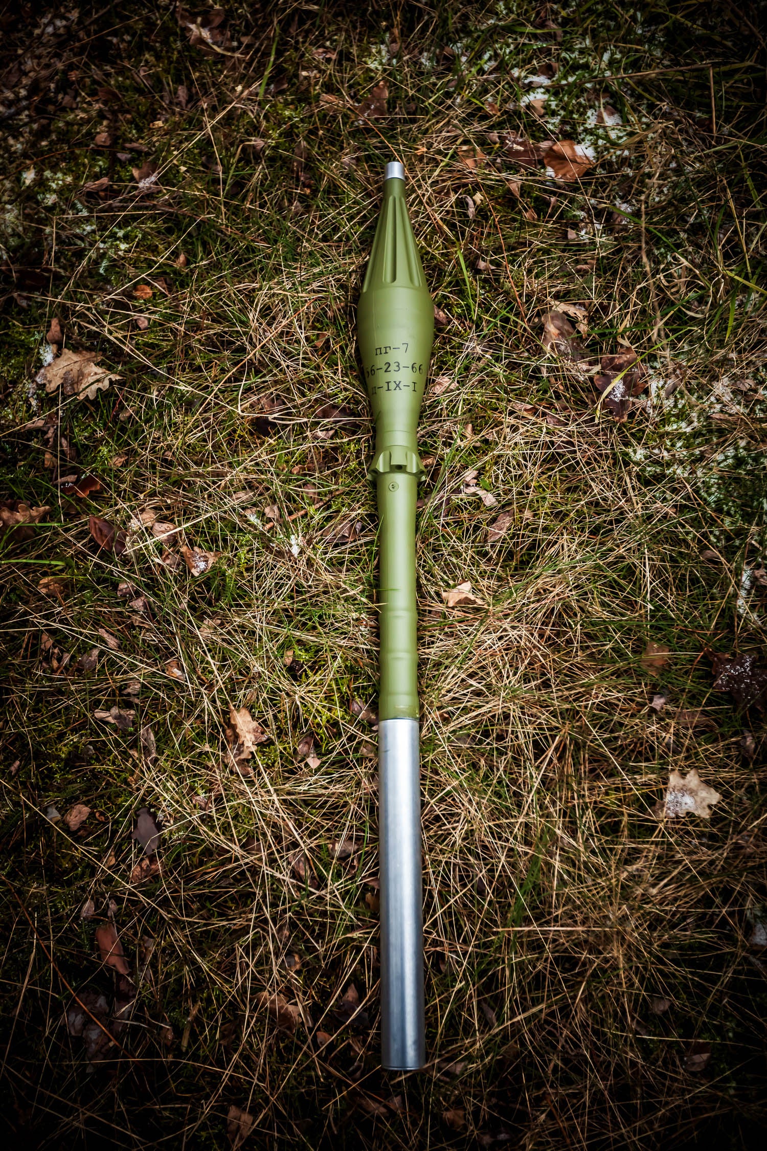 Inert replica of the Russian anti-tank handgun PG-7. In this configuration, the PG is equipped with a rocket motor, booster (unfired) and fuze. The transport cap can be removed using the safety clip. The PG-7 is equipped with the AND function (Arming-Neutralization-Disarming), see PG-7-1E. These functions are reversible and can be repeated countless times during training. Material: PA, aluminum and sheet steel