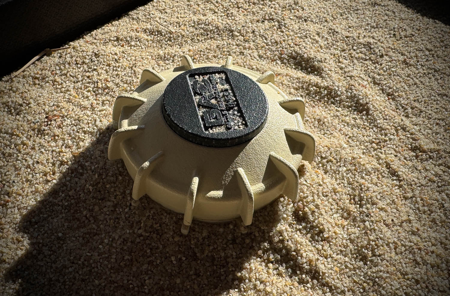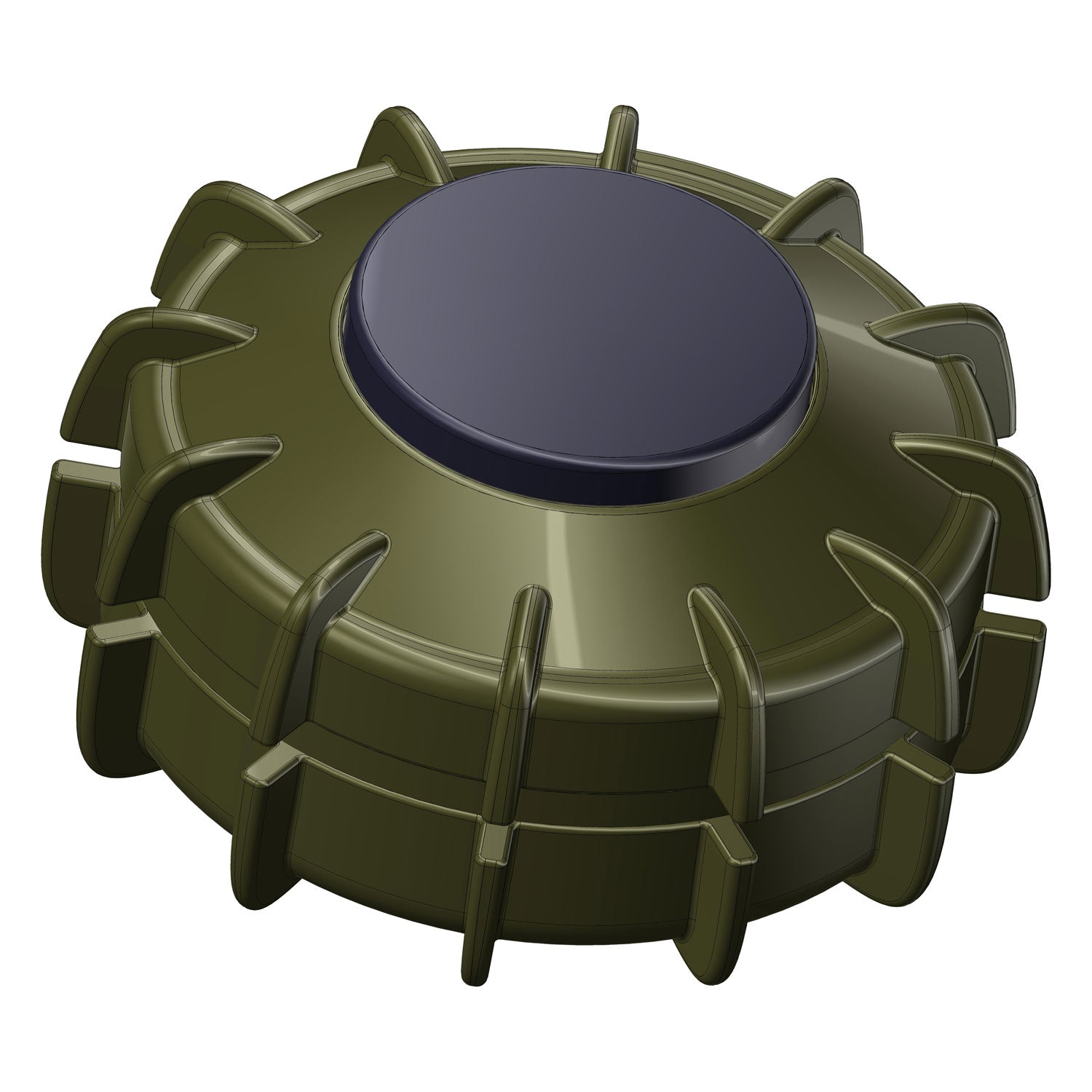 Inert replica of the Italian AP mine VS-50. Its pressure plated is sealed with a rubber top liner. The mine is equipped with a Detonater shaft for screwing in the mine's detonator and fuze well screw. The VS-50 also comes with the Safety Clamp to be inserted in bespoke hole. The mine is made of PA and PU with metal content inserted.